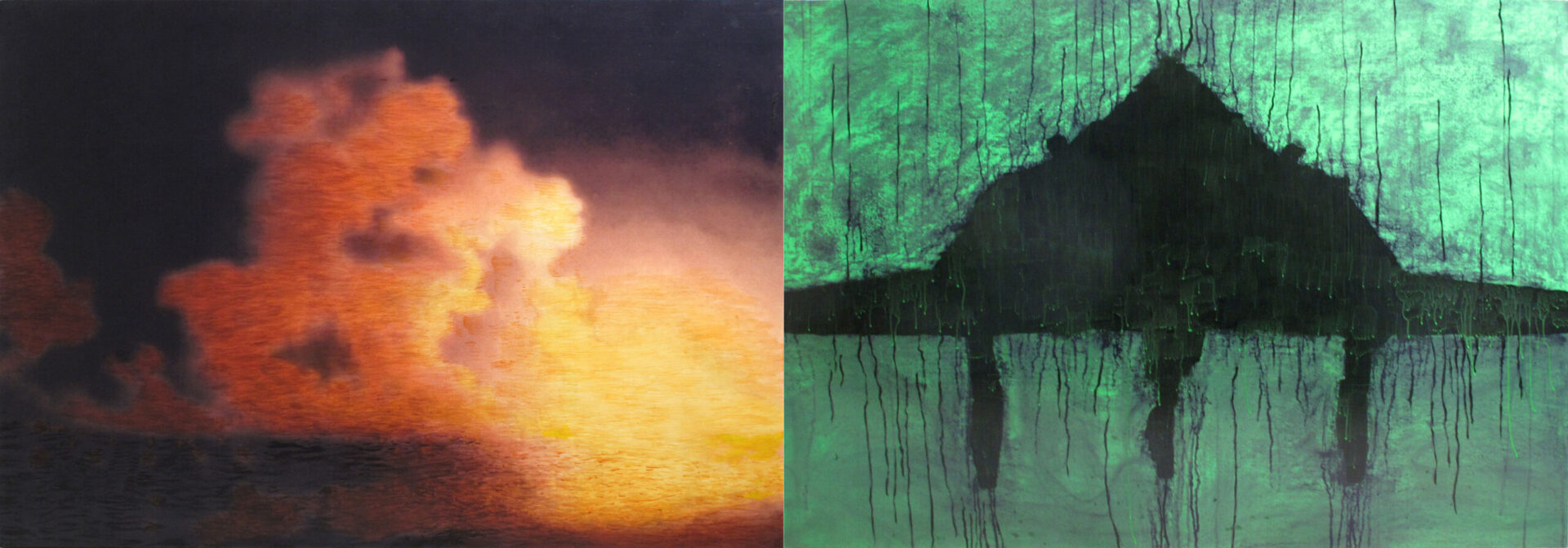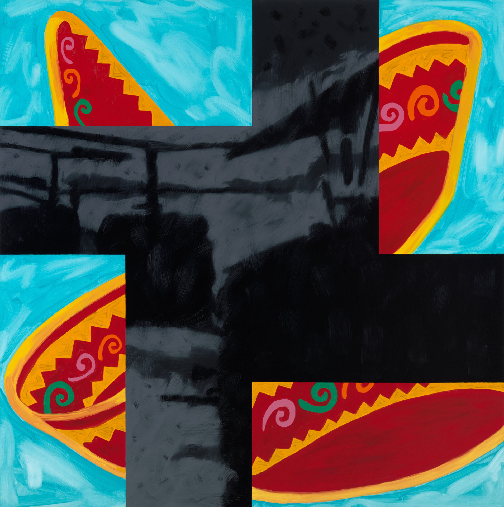 NS: The ribbon as a hard-edged painting reminds me of this device I see in many of your paintings where a photographic image is interrupted by— or has this rhythmic interplay with — these colorful fields of hard-edged abstraction, almost like panels of color. And the color has a significance; it’s chosen for its specific meanings, historically and symbolically. So it’s fascinating to see that again here, where you have the photographic image married to something more abstract which by virtue of its design and coloration refers to something quite specific. Do you remember where this photo was taken?